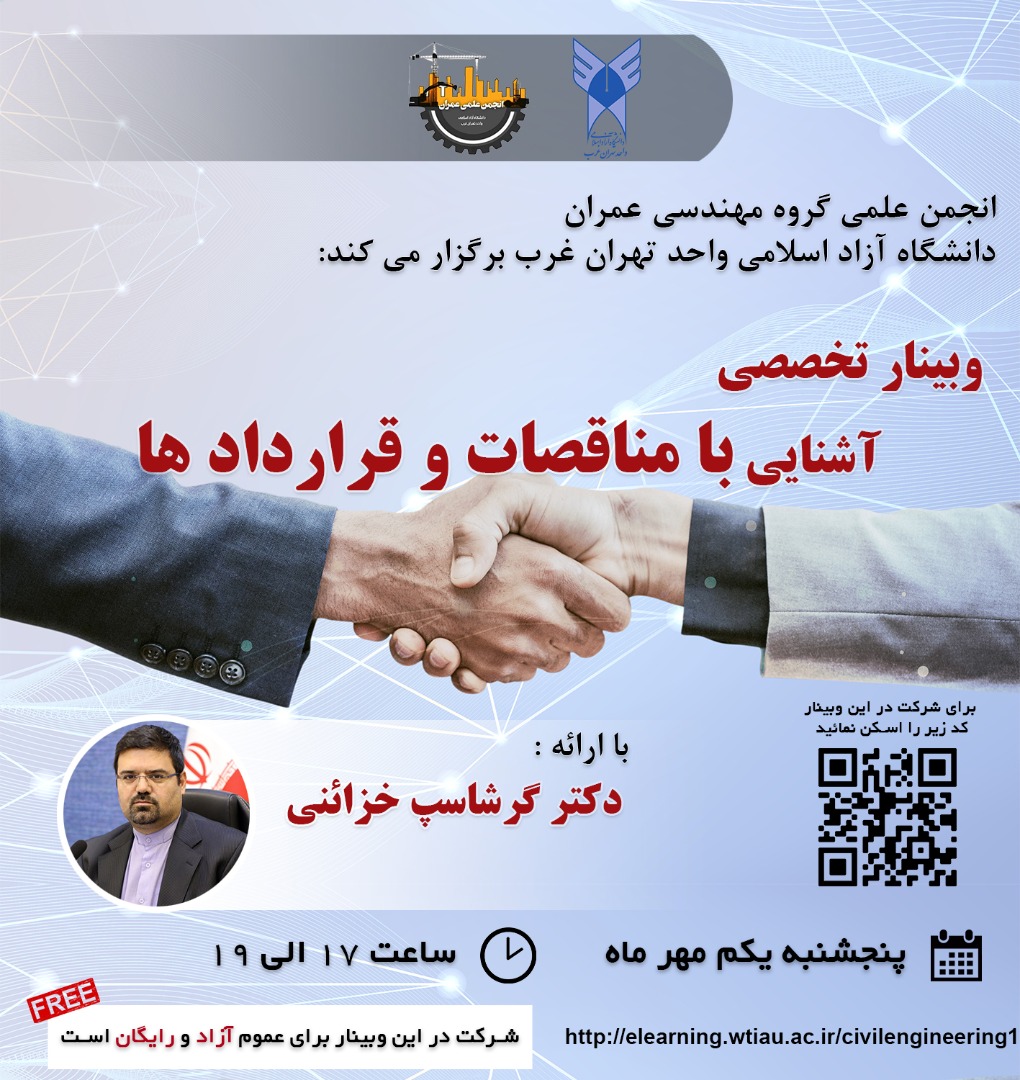 انجمن علمی گروه عمران، دانشگاه آزاد واحد تهران غرب یک وبینار تخصصی برای معرفی و آشنائی با تخصص امور مناقصات و پیمان برگزار می کند. دکتر خزائنی با هدف آشنائی دانشجویان مهندسی عمران با تخصص امور پیمان، دانش مورد نیاز و چالش های پیش روی برگزاری مناقصات و مدیریت پیمان ها در قراردادهای عمرانی را […]
